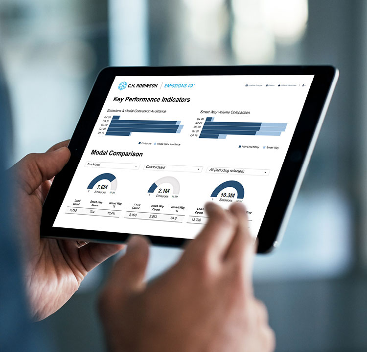 Erstellen Sie eine Basislinie für Ihren CO₂-Ausstoß und gewinnen Sie aus Ihren Transportdaten Erkenntnisse zur Reduzierung der Emissionen in Ihrer Lieferkette mit Emissions IQ™.
