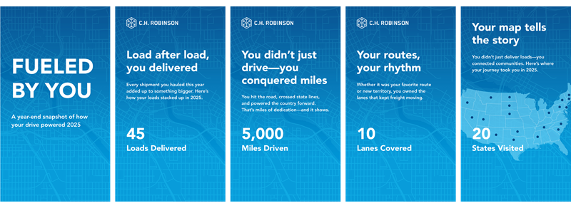 Similar to popular language learning and music streaming apps , Fueled by You offers an upbeat way for the carriers that move America’s freight to learn about the milestones they hit hauling for C.H. Robinson in 2025. It includes their number of loads delivered, miles driven, lanes covered, and states visited , sent to them through C.H. Robinson’s Navisphere® Carrier platform: