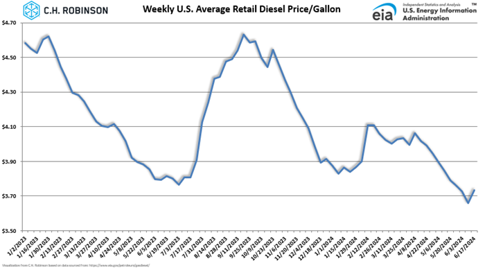 La temporada de productos agrícolas continúa ejerciendo presión al alza sobre las tarifas al contado y es probable que lo haga durante el feriado del 4 de julio. Esto varía según la región, pero los puntos más al sur, como el sur de Florida y los cruces fronterizos entre Estados Unidos y México alrededor de Texas y Nuevo México, están comenzando a ver cierto alivio de las tasas desde su punto máximo. A medida que la temporada alta de productos agrícolas continúa empujando hacia el norte, todavía estamos viendo un aumento de las tasas en el medio sureste como Georgia y las Carolinas, así como en el suroeste de California y Arizona. En general, esperamos que el costo/milla a nivel nacional alcance su punto máximo la semana del Día de la Independencia y se retrase en la semana siguiente. Dado que el 4 de julio cae en jueves, es probable que haya muchos cargadores (y transportistas) que se tomen el viernes 5 libre del trabajo y traten de "compensar" la pérdida de dos días de envío poniéndose al día y aumentando el envío la semana siguiente.